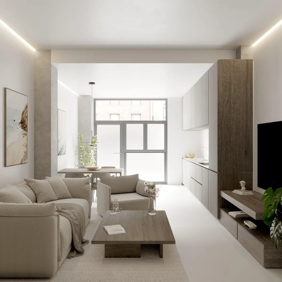 La imagen es meramente orientativa, no constituyendo documento contractual alguno. Pueden existir modificaciones que devengan impuestas por la autoridad u organismos competentes, así como motivadas por exigencias de orden técnico, jurídico, comercial, de disponibilidad de materiales o por ser necesarias o convenientes para la correcta finalización de la promoción sin que ello implique menoscabo en el nivel global de calidades. El equipamiento tanto de las cocinas como electrodomésticos y mobiliario representado en las imágenes, se muestra a nivel orientativo, por ende, no vienen incluidos con las viviendas.